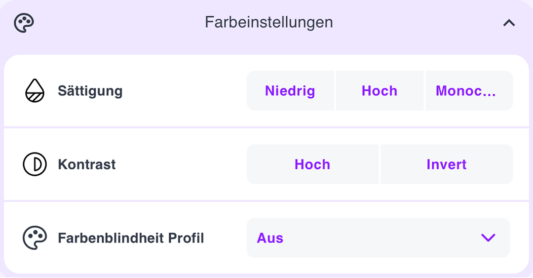Unser KI-gestütztes Barrierefreiheits-Widget enthält jetzt spezielle Profile für alle acht Arten von Farbsehschwächen. Bei der Entwicklung dieser Funktion stand die Einfachheit im Vordergrund — für Nutzer ist das ganz einfach: